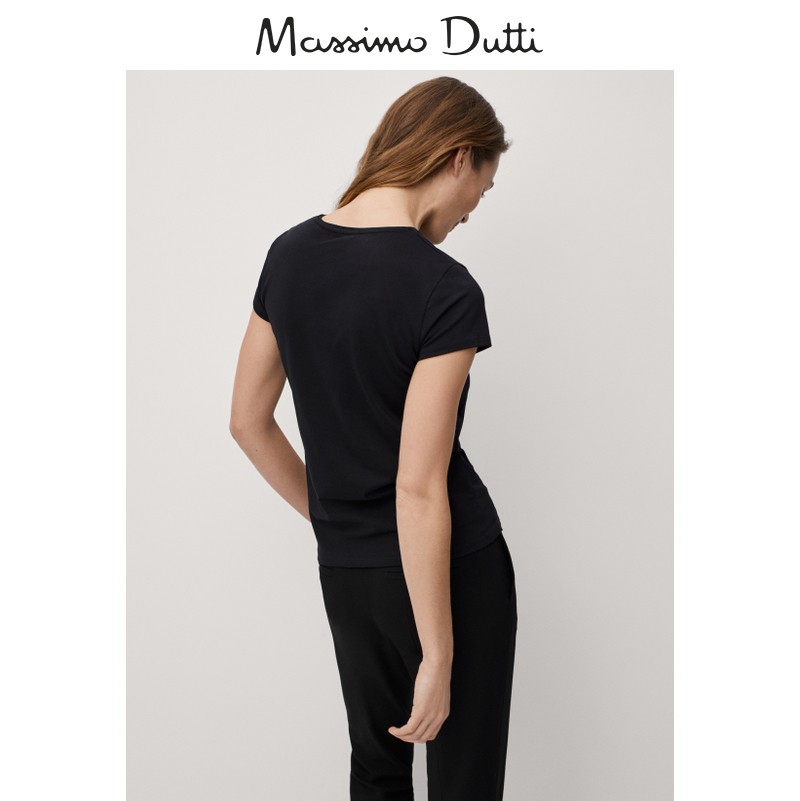 Massimo Dutti Women's Slim Print Short Sleeve Round Neck Basic Black Base T-Shirt 06850900800