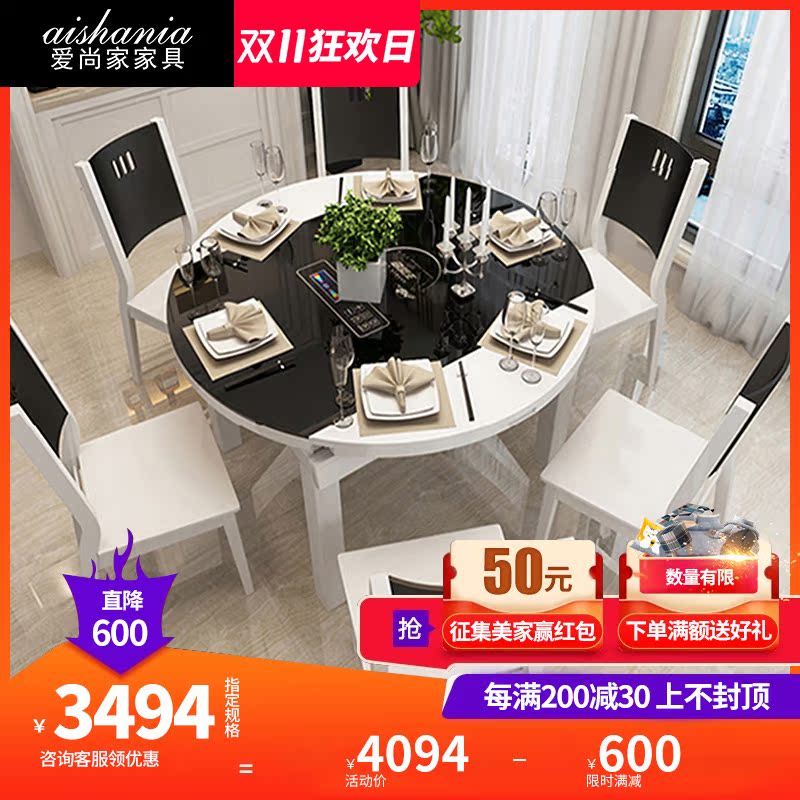 Modern simple telescopic folding tempered glass solid wood dining table and chair combination Nordic multi-functional round table with electromagnetic stove - Taobao